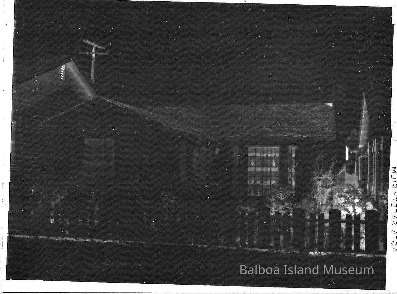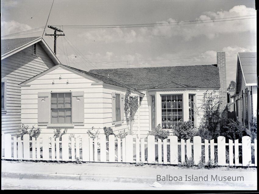 Photograph negative. Image is of the Rider house at 318 Coral (Lot 10, Block 16, Section 3). Envelope reads: "Rider, about 11-16-3 Coral, 1939". Image features a single story house with wood slatting, a side-facing front door blocked from view by a trellise and a front-facing bay window with vase-patterned curtains. It also features window shutters with swans carved into them on the front most window.Collection