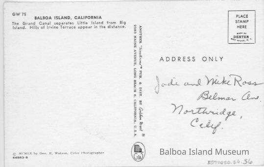 Addressed to Jodi and Mike Ross in Northridge California but not sent or may have been sent with a letter in an envelope. Published by Golden West and printed by Dexter Press. Postcard number GW 75. Print number 44883-B Copyright MCMLX by George E. Watson, photographer.Subject