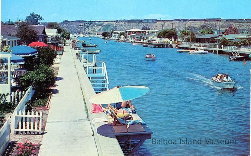 A color postcard taken from grand canal's sea wall looking down the canal towards Irvine terrace, which has houses at the top of the cliff. Taken from main island side.