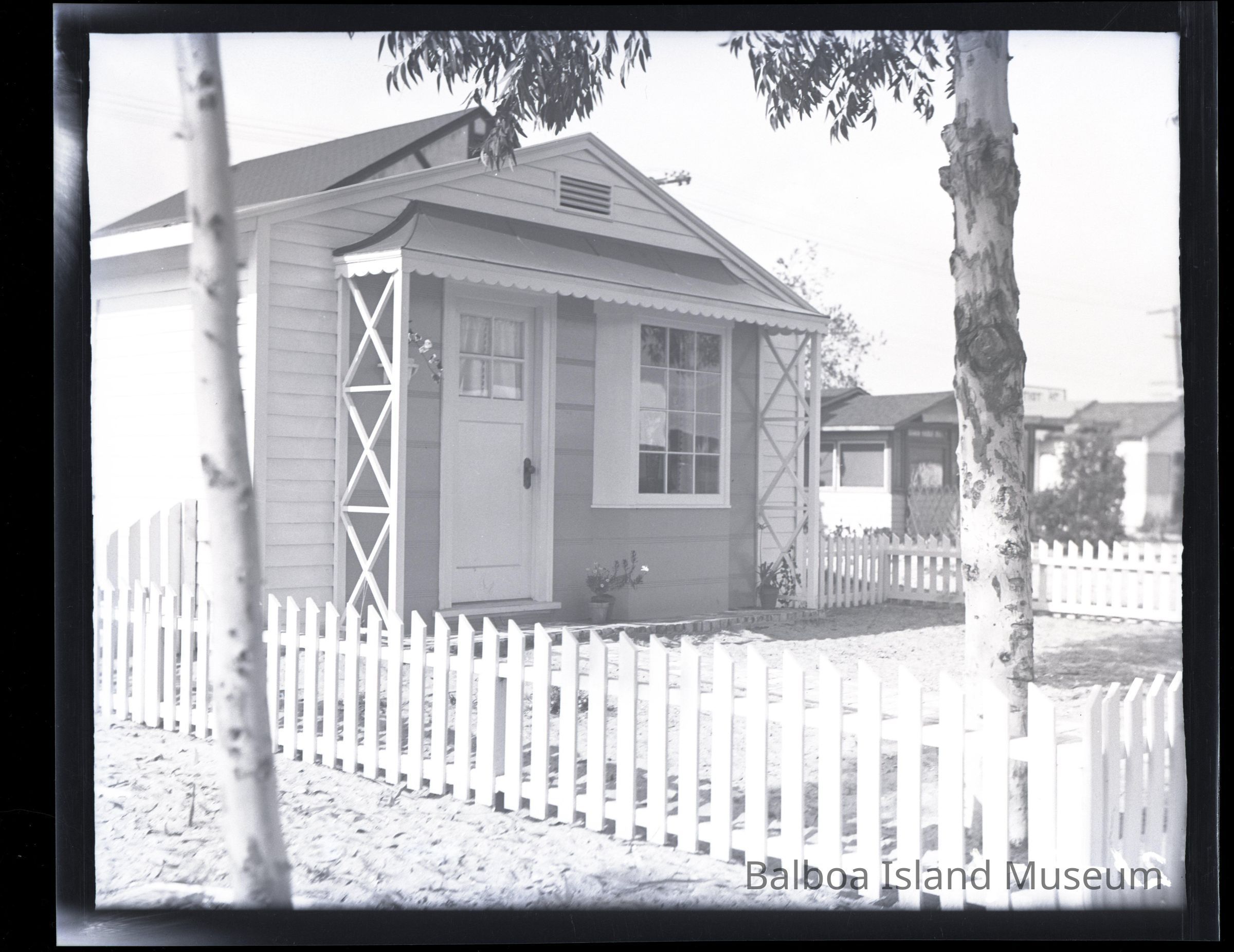 Photograph negative. Image of the house at 118 Marine. House has trellishes on either side of the front and a small awning covering the front porch area. There is one large paned window and a door with a small paned window.
