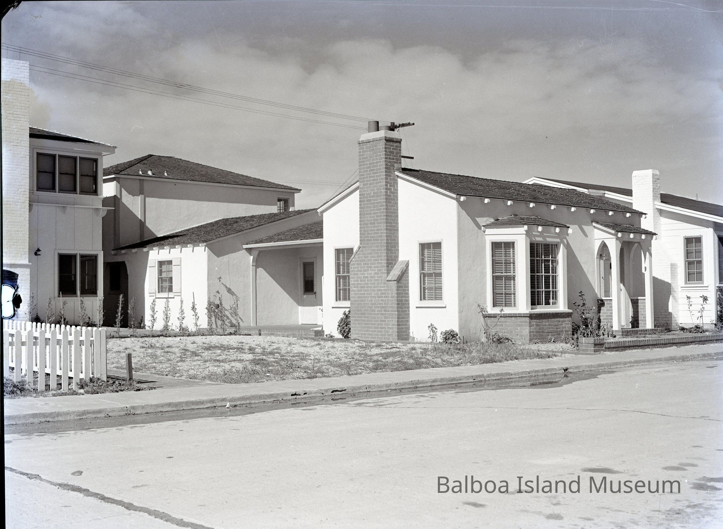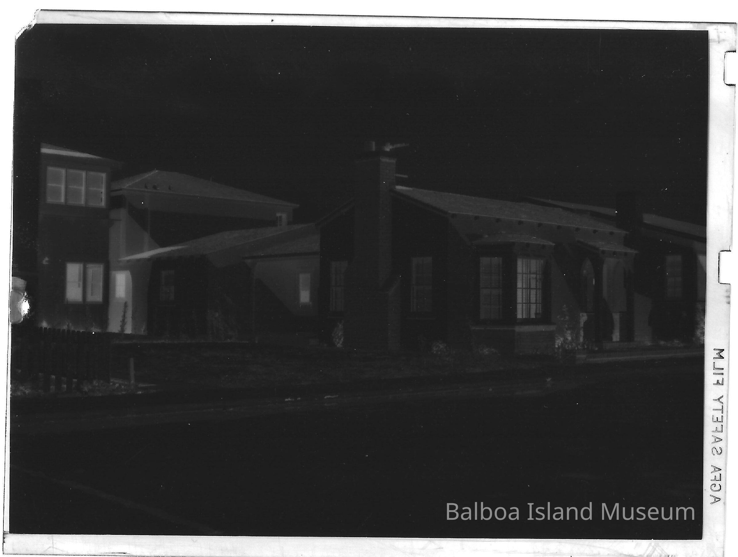 Photograph negative. Features the Kaiser H house, which was located in section 1 of the island (envelope). It was taken in Feburary of 1939 when the house was about 1 year old. The house is a single story with a front bay window and a small overhang avobe the front door. There is a fireplace on the left side of the house and a patio on the back.Collection