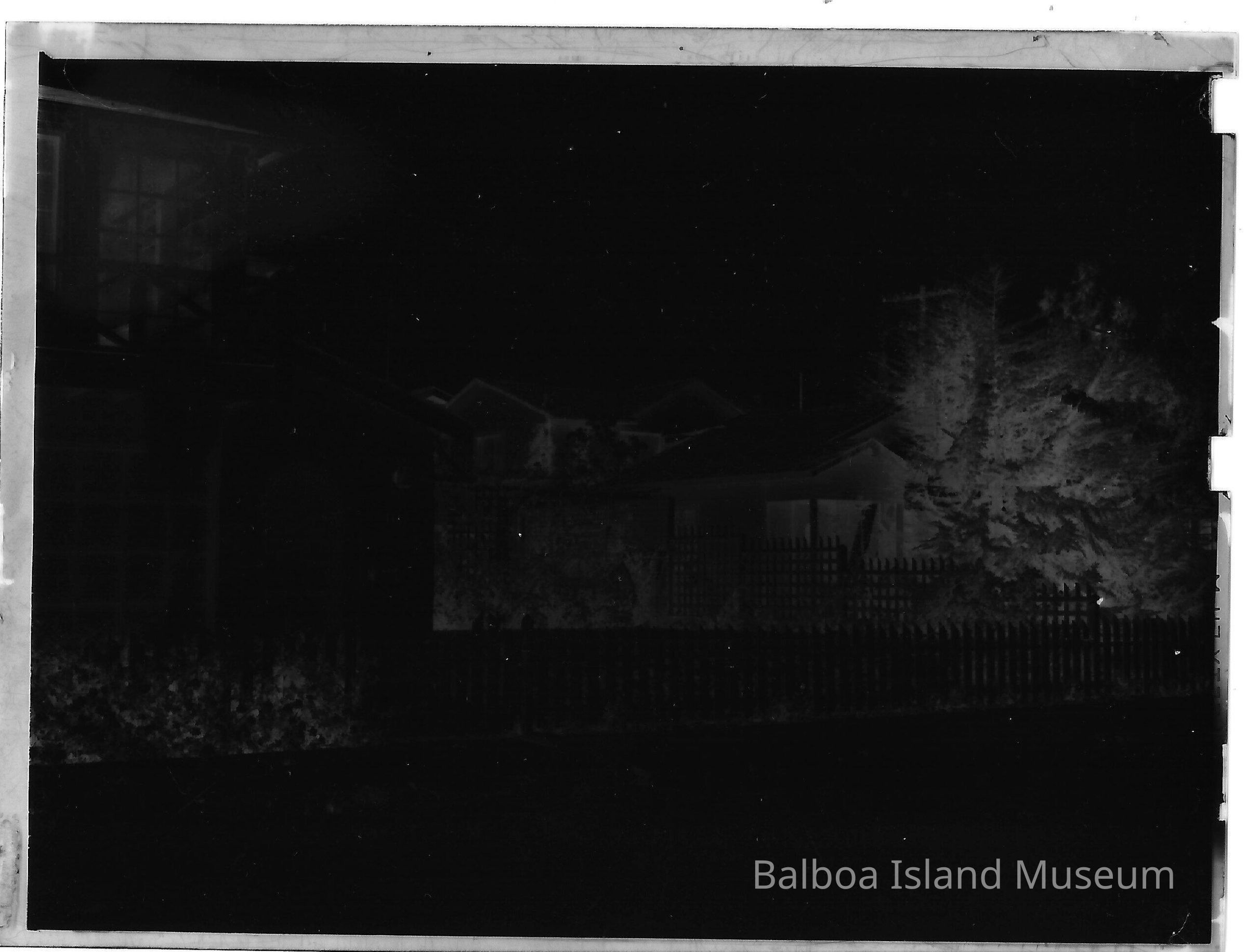 Photograph negative. The image is of the house at 112 and 116 Onyx avenue. The focus is mainly on the garden space for what looks like 116 Onyx with the house at 112 Onyx appearing on the far right side of the image. Tall pine trees largely obscure 112 Onyx.