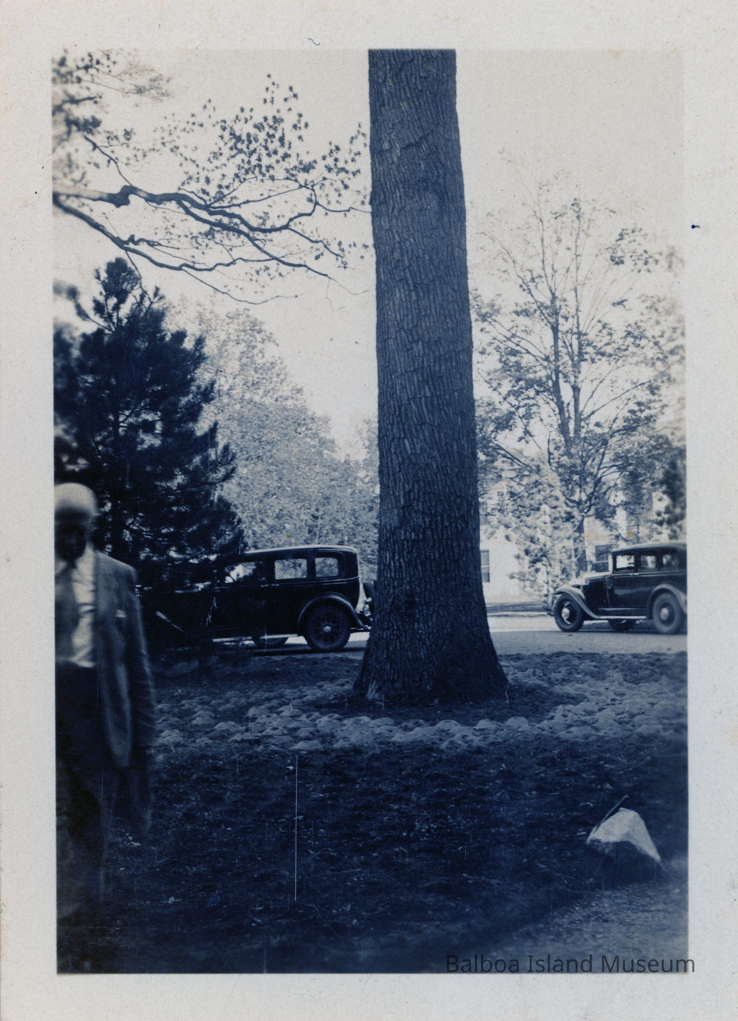 Photo with a man to the far left , a tree in the center with a couple of Fords from either the 20's or 30'sPhotograph Details