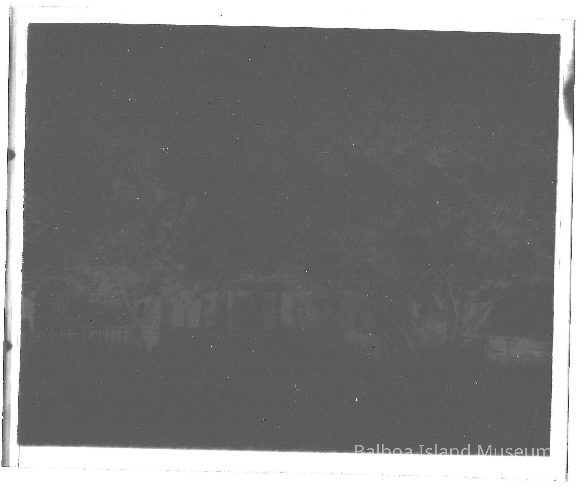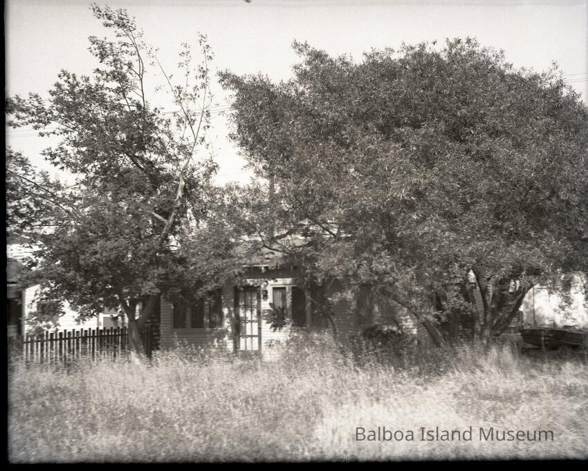 Photograph negative. Image is of 208 Abalone Avenue from 1937. The image is a little blurry and the house is half hidden by trees along the front.