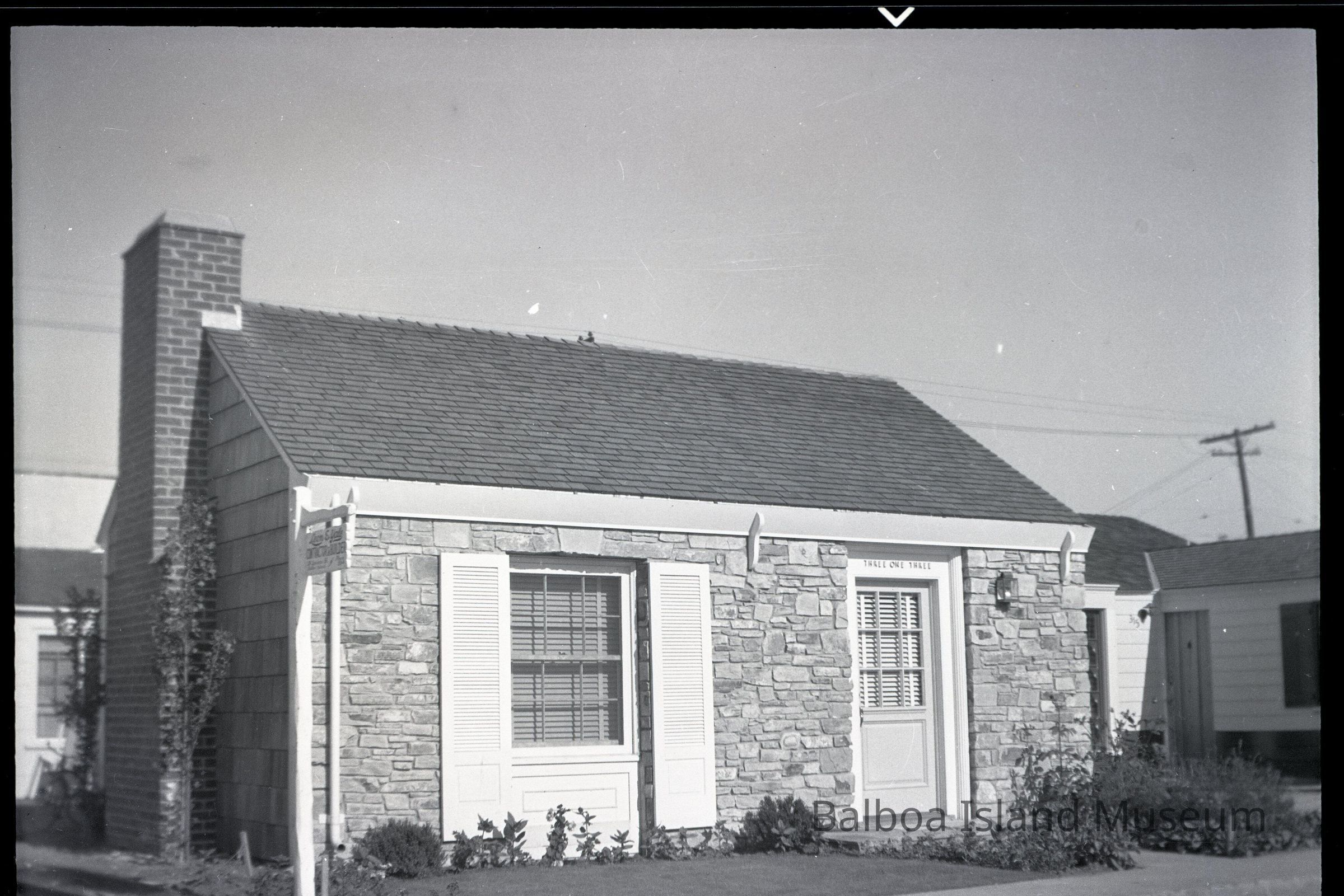 Photograph negative. Image is of a building at address 313. The street is unknown. The building is a small stone building that appears to be an office rather than a home. There is an illegable business sign on the left side.