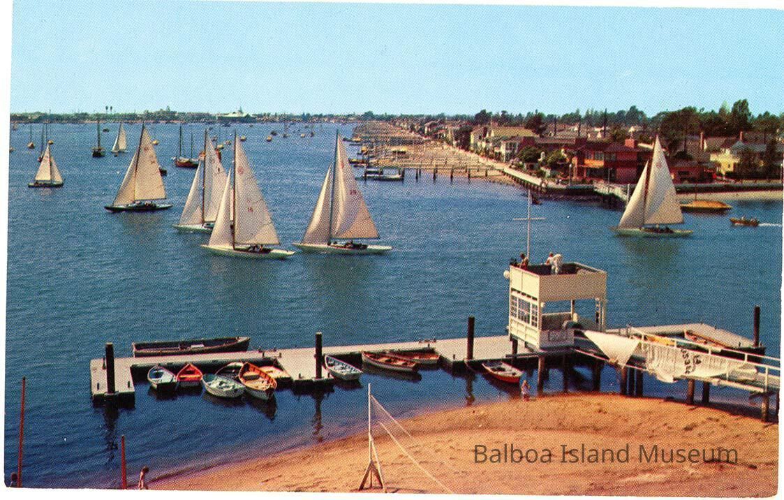 A color photograph of the very end of South Bay Front on little island taken from immediately across the Balboa Bay at the Balboa Yacht Club. The yacht club docks are along the bottom of the photograph along with the club's beach. A group of small sailing ships, possibly snowbirds, are coming out of the Balboa Bay channel.