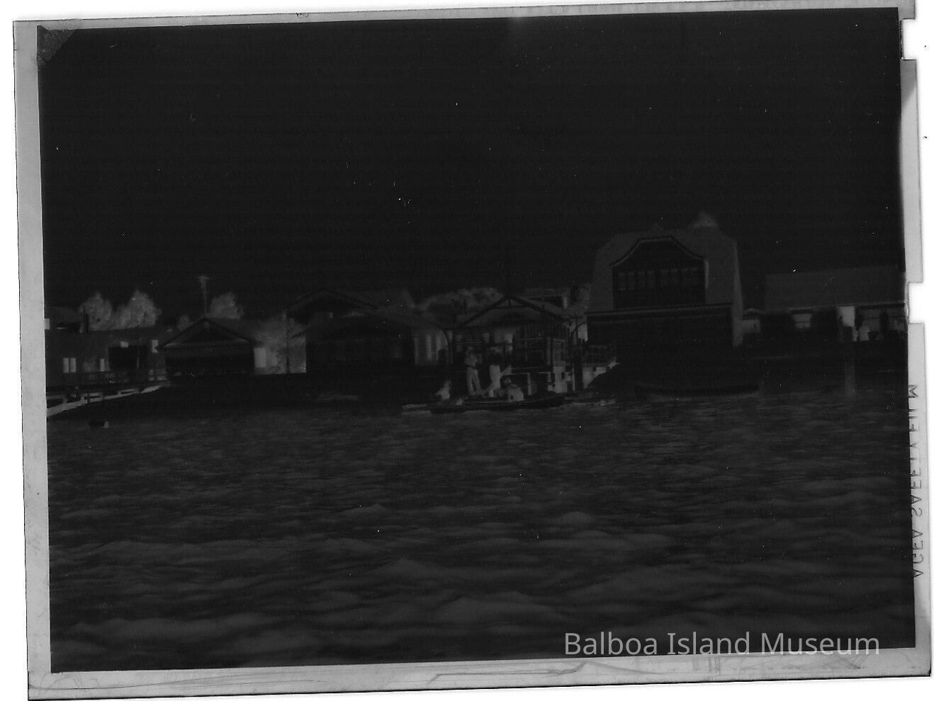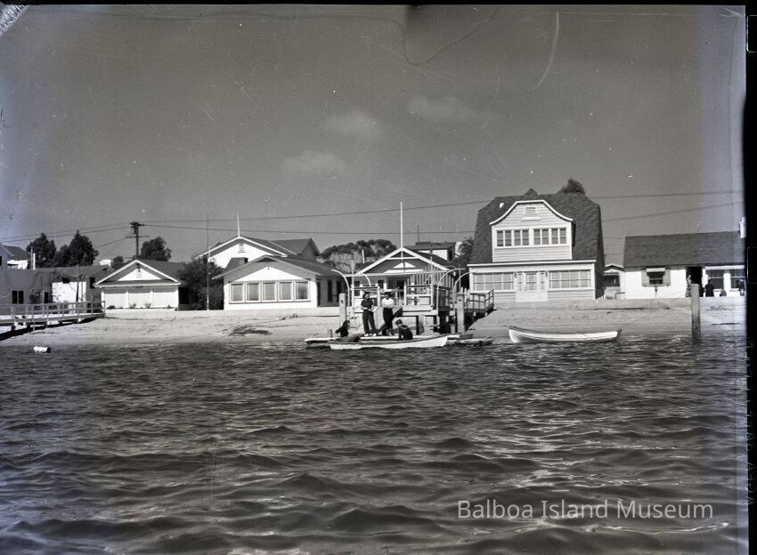 Photograph negative. The image is of five houses on the 1100 block of South Bay Front. The image is a head-on image of the street. There are four men in a boat at the end of a dock in the image. The fourth house in appears to be a Dutch Colonial style house.