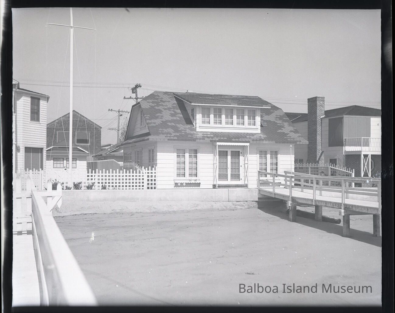 Photograph negative. The image is of a Dutch colonial revival-style1804 Bay Front avenue house on 1804 Bay Front avenue, originally 1304 Bay Front. It is two stories tall and has a dock leading onto the water. There are two glass doors that open onto the dock and a set of five tall windows along the gable end. The house was located on South Bay Front on Little Island.Collection