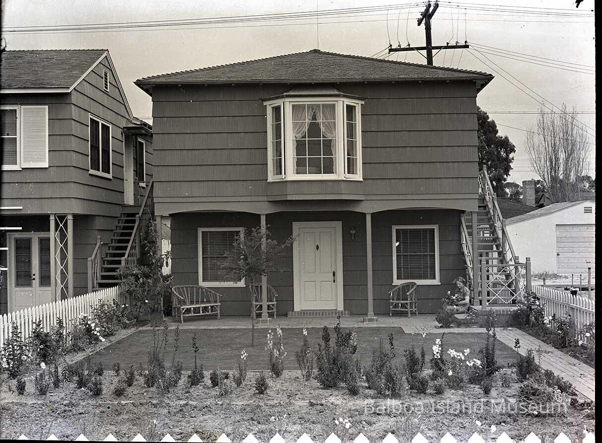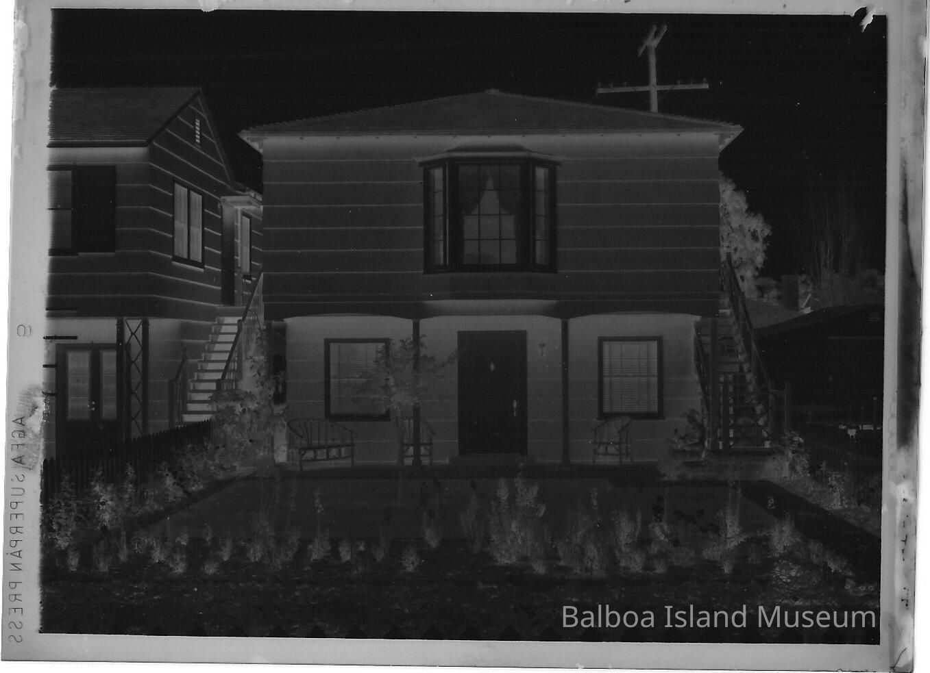 Photograph negative. The image is of a two story house with a large bay window set in the senter of hte second floor and two rectangular windows flanking the door. There is a staicase on the right side leading up to the second story. This may be a back unit. There is either a woman or a statue in the photograph on the right side holding a bouquet of flowers.Collection
