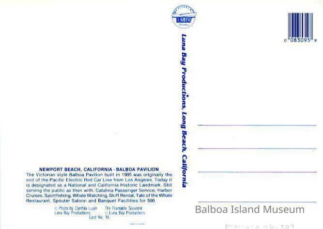 Published by Luna Bay Productions. Photograph by Cynthia Lujan. Postcard number 18. There is a blurb on the back about the Balboa Pavilion.Subject