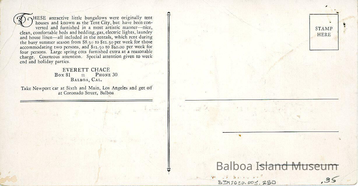 A colorized photograph of the Balboa Tent City following the conversion of the tents to buildings but before the name of the establishment had changed to the Yellow Houses. The postcard is very long and railroad tracks run in front of the buildings. Most of the site can be seen in one photograph. Title is printed along the bottom of the postcard.