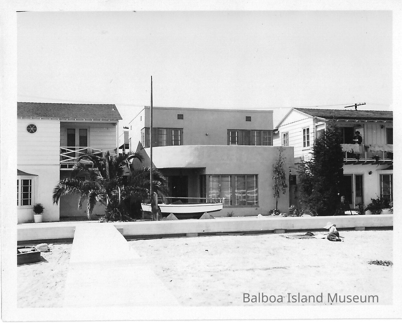 Photograph of the Charlotte Mulligan. The house was located at 211 E. Bay Front. It was two stories tall and made from cement. The second story balcony was curved on the left side and provided an overhang for the front door which faced the water.Collection