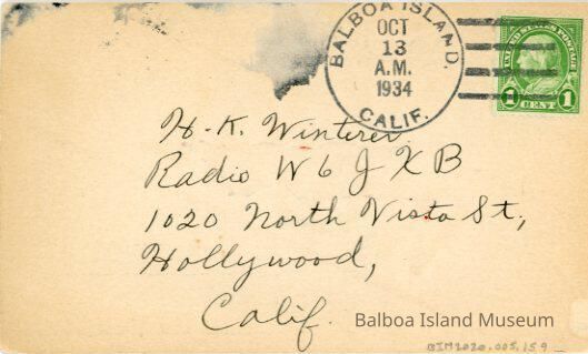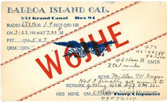A QSL confirmation card confirming a radio message received at 331 Grand Canal. The message was from radio W6JXB, whose operator lived in Hollywood. The front has a message about finally getting around to getting QSL off OM-Hi. Operator receiver's radio was W6JHE. Receiver was Miller 711 Super. Received at 3-22-1934 at 7:23 PM. The card was sent on October 13, 1934 in the AM.Collection