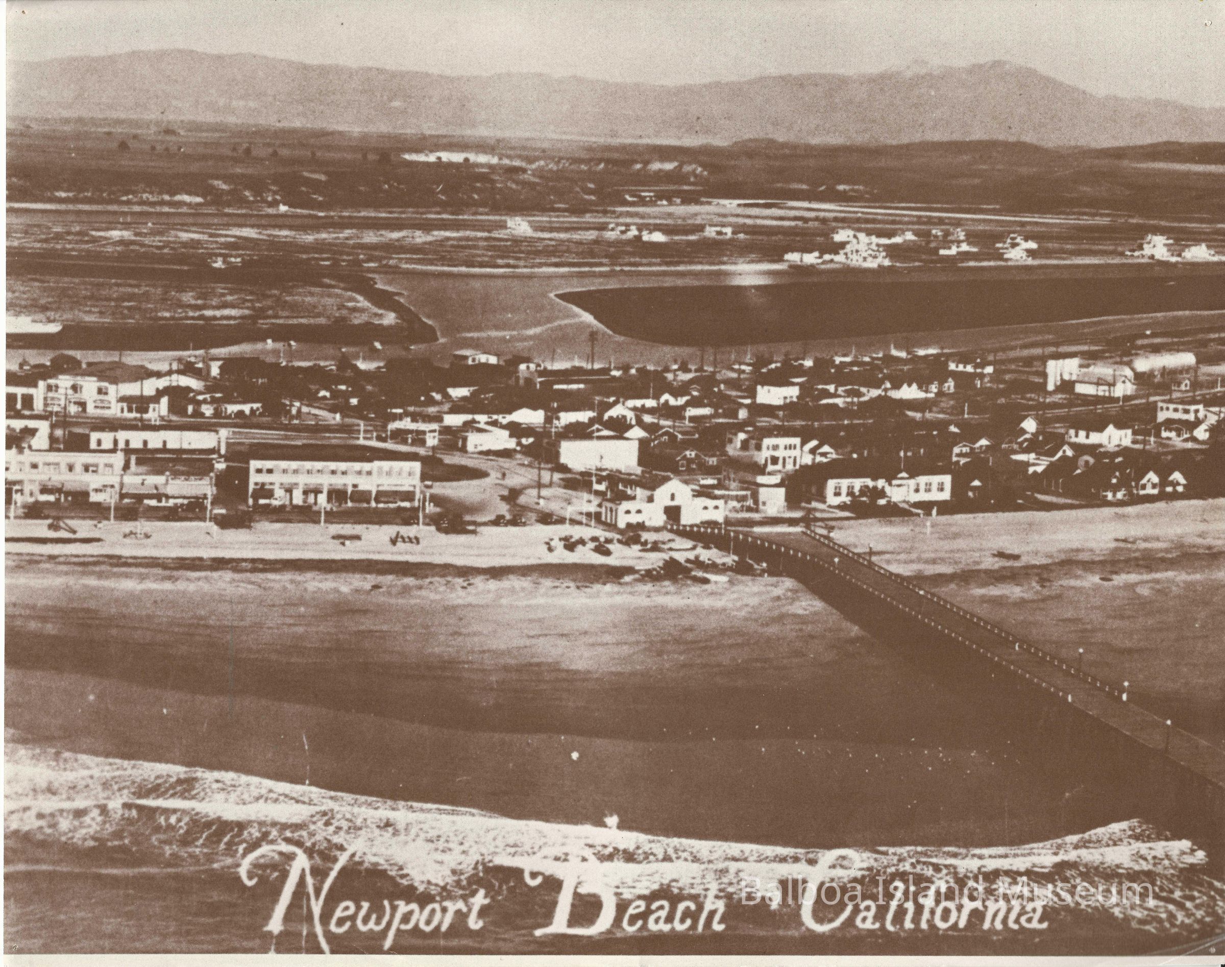A sepia print of an old photograph of the Balboa Peninsula featuring a dock and a barn-like structure. It is an ariel photograph with a dock going off to the right corner of the image and crashing waves along the bottom. The words "Newport Beach California" are imprinted on the bottom of the image.Lexicon