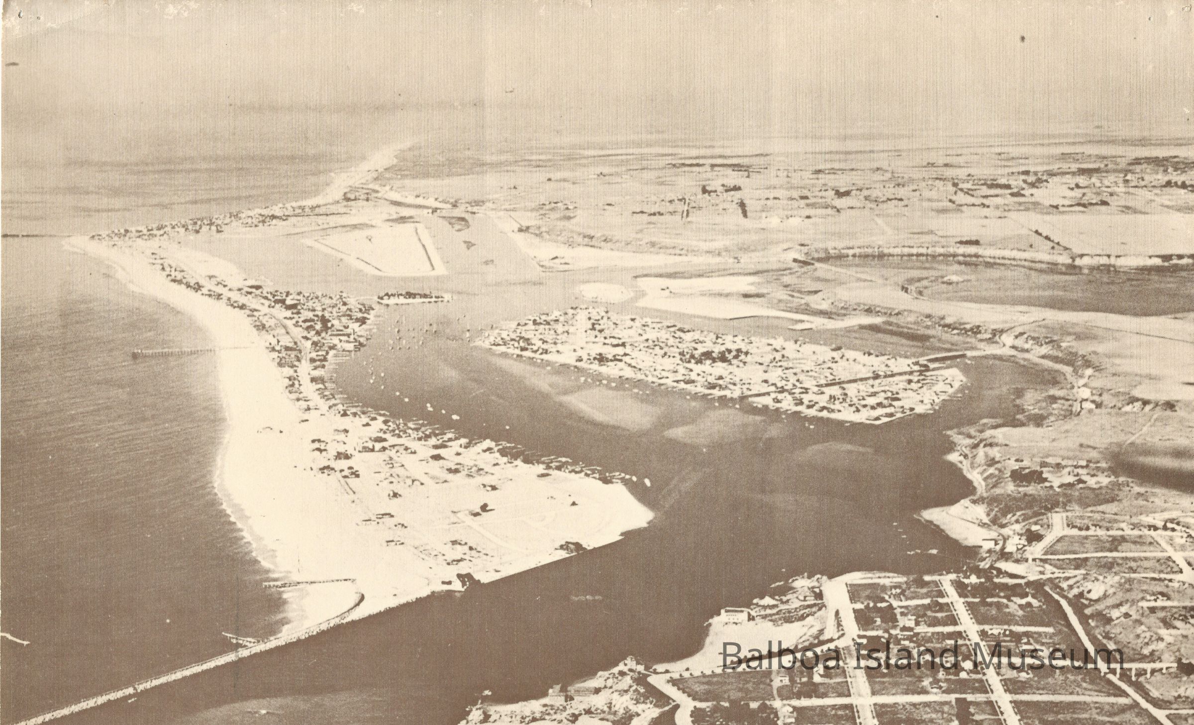 Sepia photograph of the Newport Bay outlet into the pacific. The image shows Corona del Mar beach and The Wedge. Lido island is visible near the back and hardly developed. Balboa Island is visible in the middle and shows a lot of development. Ariel photograph.Lexicon
