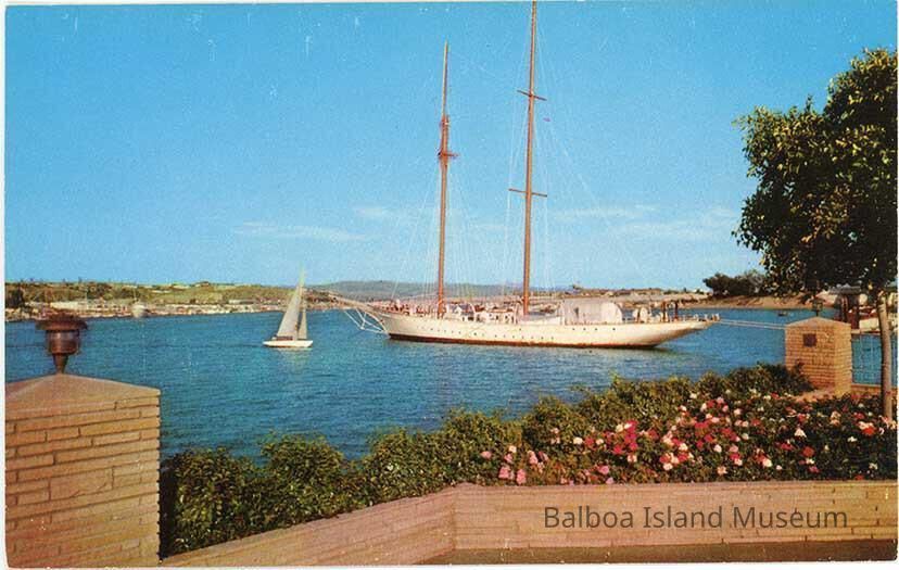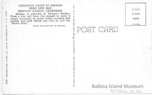 A color postcard of a boat anchored off short near Lido Island. Taken just beofr eethe Newport Bay Bridge from either Linda Island or the marina just to the south east of the Lido Island Bridge.