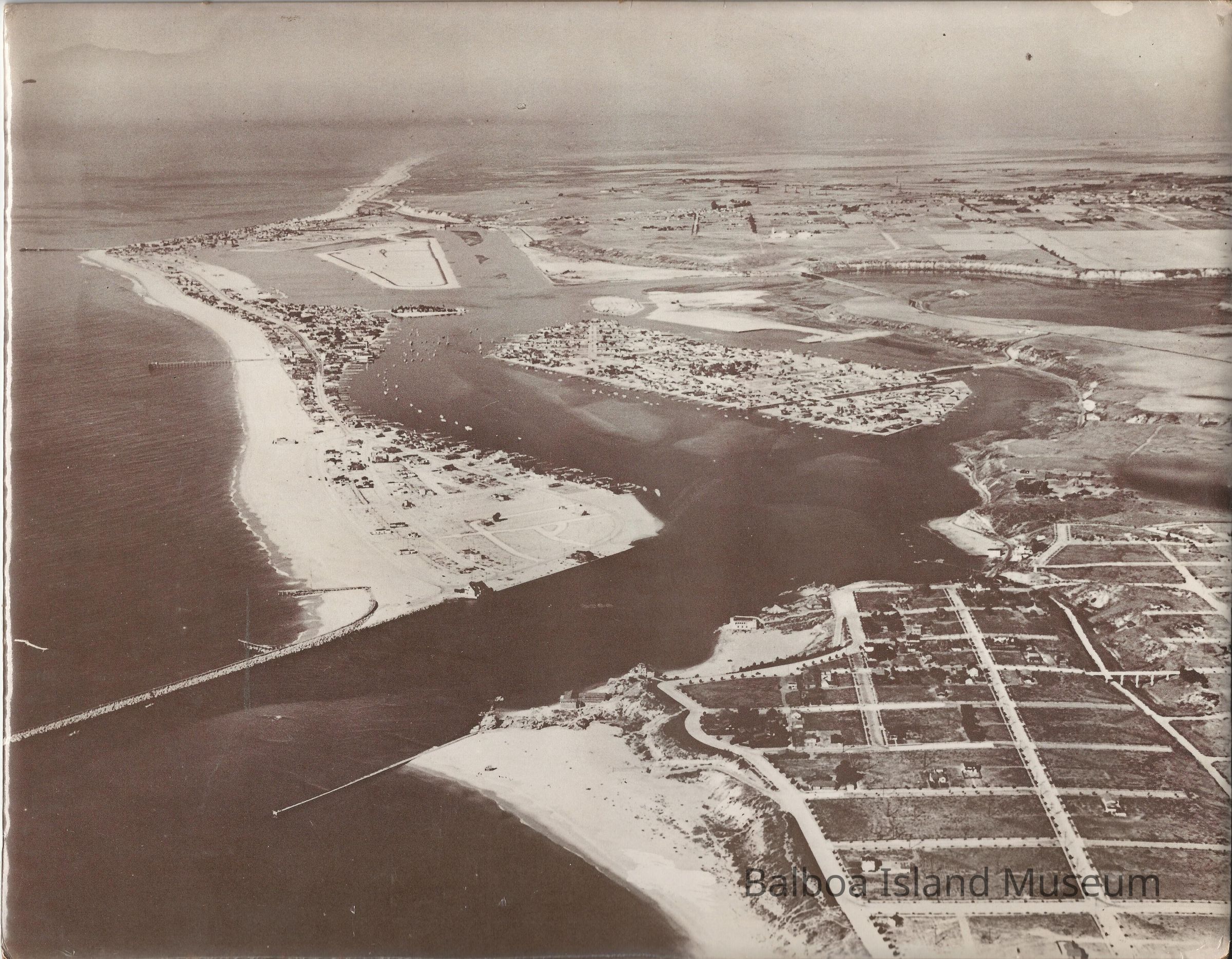 Black and white print of an old ariel photograph of Newport Bay and the outlet into the Pacific Ocean. The image features a barely developed Wedge and Corona del Mar beach. Balboa Island can be seen in the midle of the harbor, as can Lido Island in the upper left side.