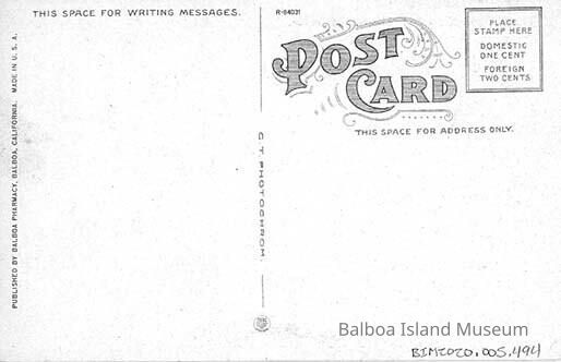 Unused. Published by Balboa Pharmacy. Printed by Curteich-Chicago. Stamp box is a triple solid border with "place Stamp Here Domestic One Cent Foreign Two Cent" written inside. Print number R-84031.Subject