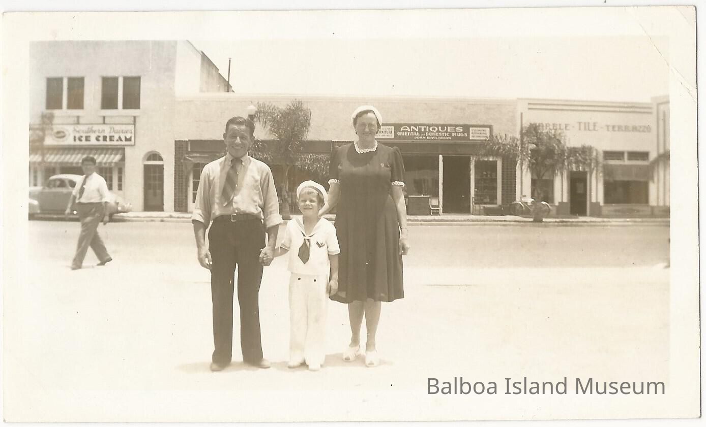 Black and white photograph of Herman, Frances, and Rolly. Rolly is dressed as a sailor. There's an ice cream shop, an antiques shop, and a stone shop. It's taken on the same street as 2016.65.28.Photograph Details
