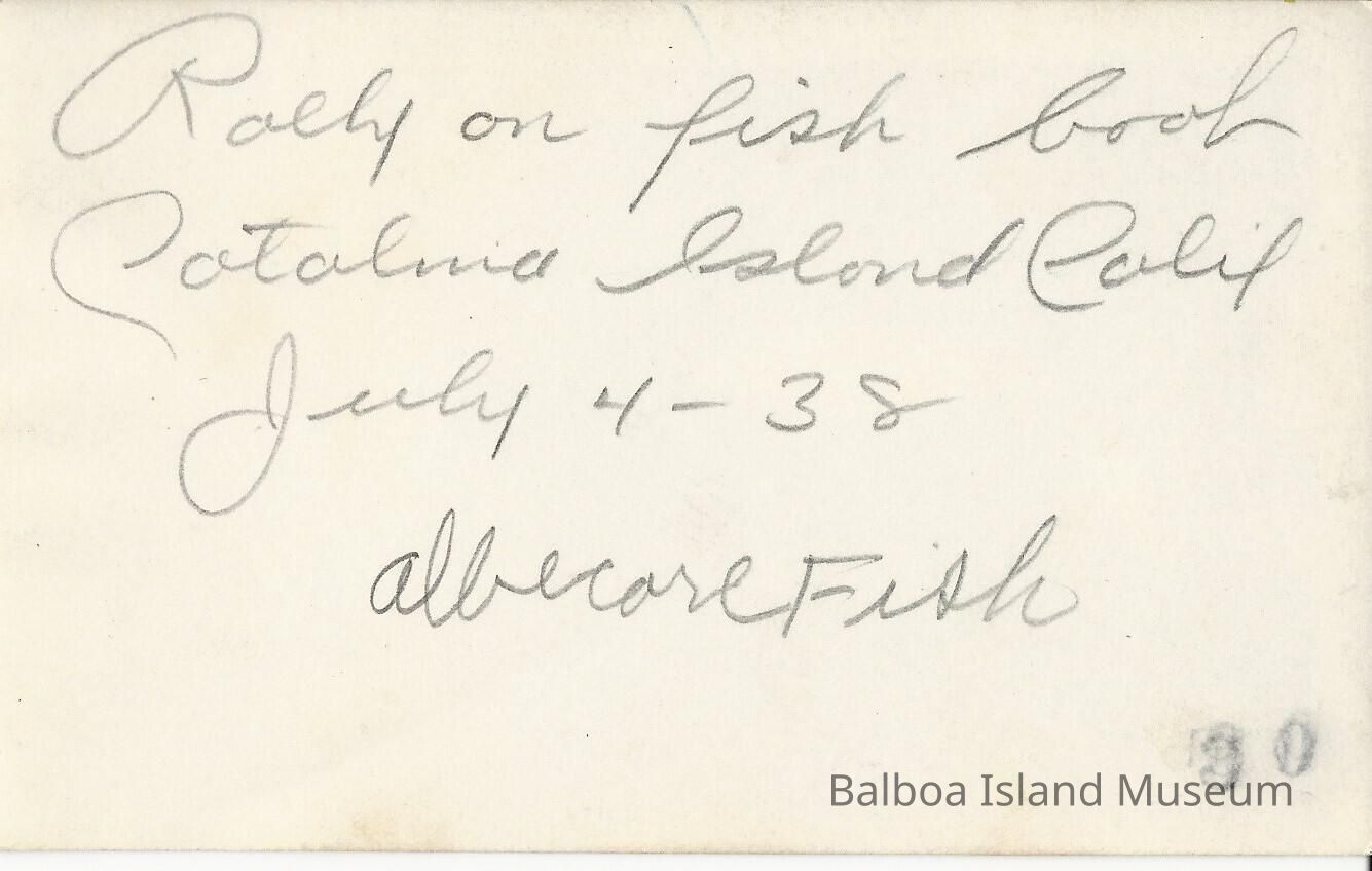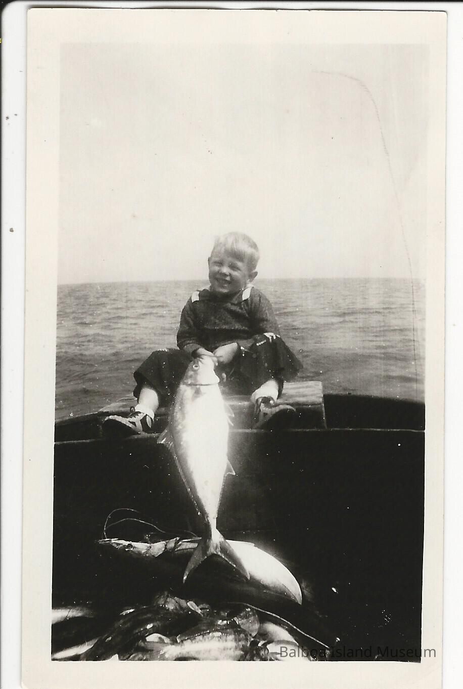 A black and white photograph of Rolly on a fishing boat off Catalina Island with an albecore tuna. Rolly does not look older than five. The photograph was taken on July 4th, 1938.Photograph Details