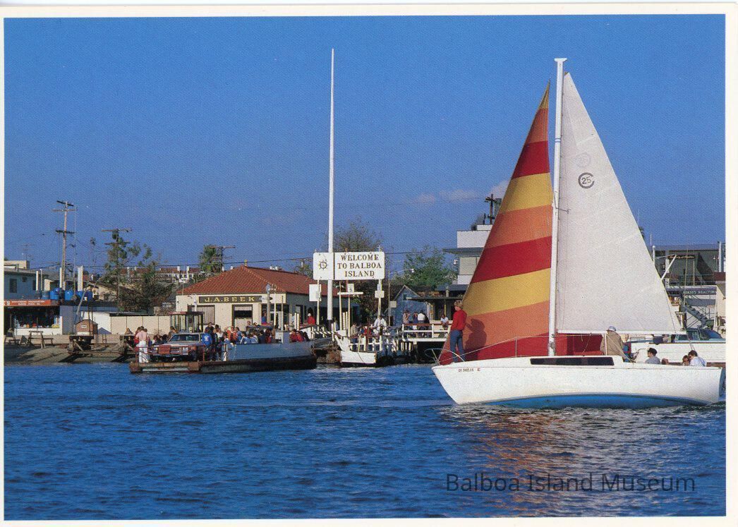 A large color postcard of the Balboa Island Ferry landing as the Ferry is beginning to pull away. There are people on the boat along with cars and several more people waiting on the dock for the next boat. The J A Beek building is behind it and the "Welcome to Balboa Island" sign is above the landing. There is a mid-sized sailboat with a colorful red-yellow-orange sail that is heading into the path of the ferry.