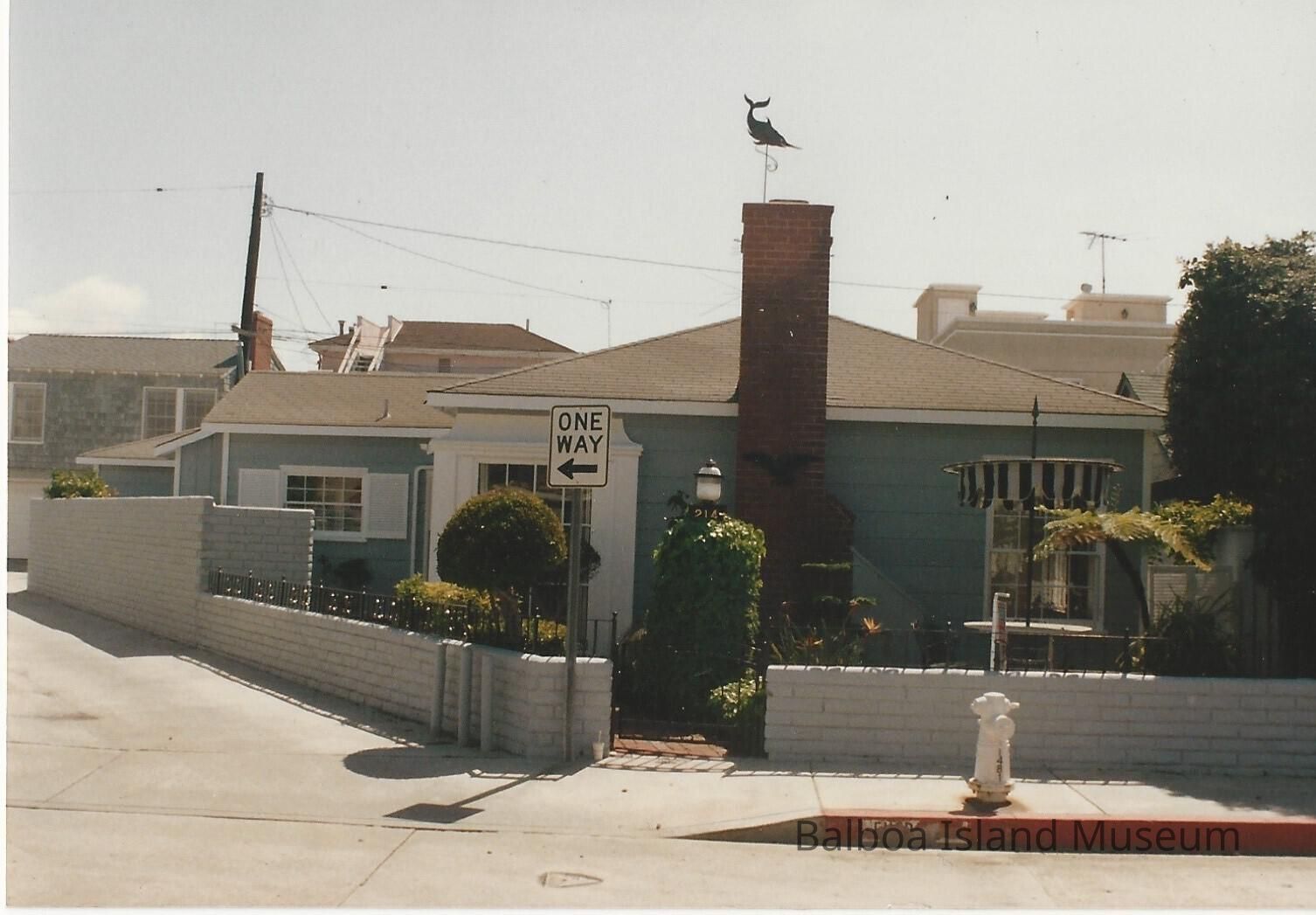 A photograph of the house at 214 Emerald. It is light blue with a bronze eagle on the fireplace and swordfish on the chimney top. The house is one story.Made/Created