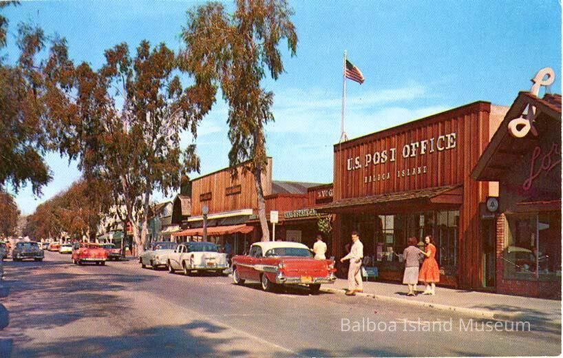 Color photograph postcard showing the Balboa Island post office, Seely Photo studio, and 210 Marine. Taken from in front of the Hal Will Smith Realty Office/Jolly Roger.