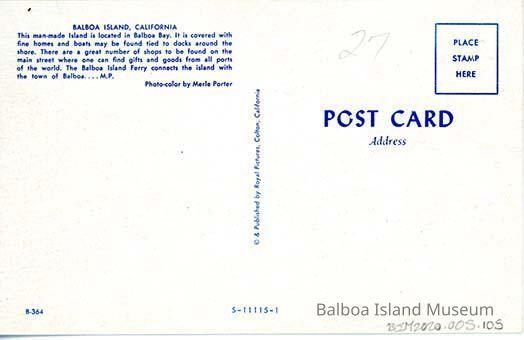 Never sent. The back has a small blurb about Balboa Island written by Merle Porter. Photograph by Merle Porter and published by Royal Pictures in Colton, California. Post card number B-364 and S-11115-1.Subject