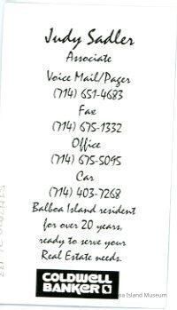 A small business card found inside the notecard featuring the painting by Ruth Hynds. The card shows the house at 125 Grand Canal on the front taken from across the canal. The back contains the contact information for Judy Sadler, who lists a pager number, fax number, office number, and car number. She was an associate for Coldwell Banker.Collection