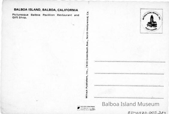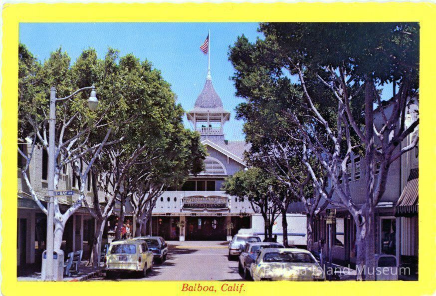 A color postcard of the Balboa Pavilion taken from the intersection of Main St. and East Bay Ave. The photograph has a yellow border with Balboa, Calif. written on the bottom. The printing on the back erroneously identifies the Pavilion as being on Balboa Island.