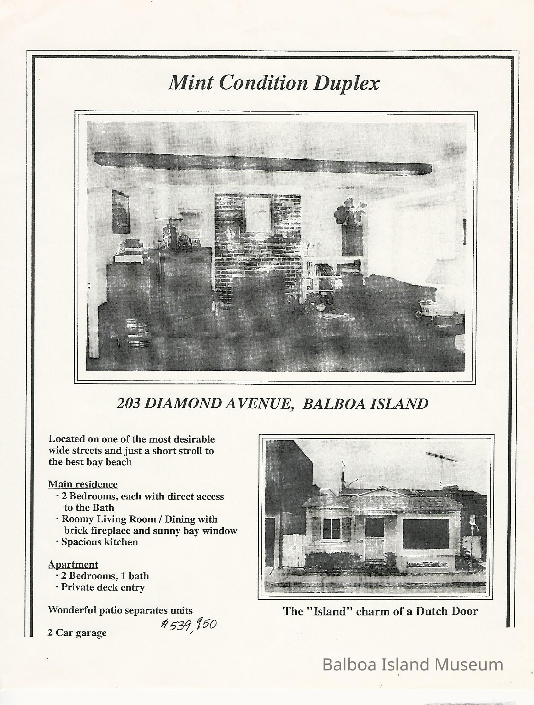 A black and white flier advertising for the sale of 203 Diamond Avenue at $539,950. The flier had a photograph of the inside and outside of the house and lists off the amenities for the duplex.Create Date
