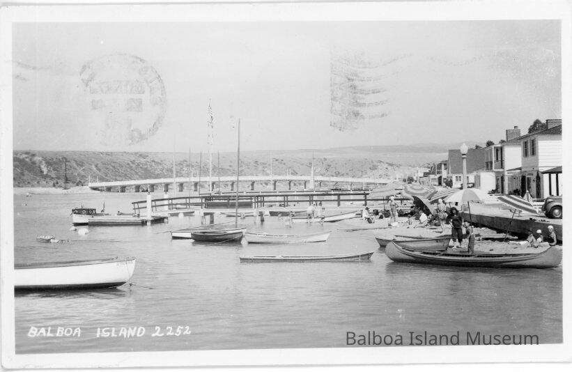 A black and white photograph postcard taken along north Bay front looking at the Balboa Island Bridge and the hills that became Irvine Terrace. There are a number of small boats and canoes along the shore and a private dock. The photograph was taken around the 1100 block (the cure in the beach is visible).