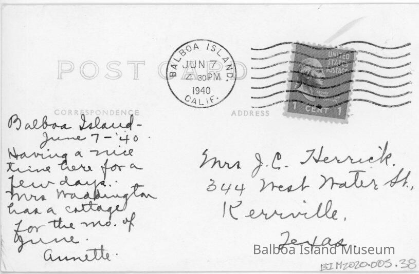 Standard postcard back with an EKC stamp box. Two copies, one sent and one blank. The sent one was mailed from he Balboa island post office on June 7, 1940 at 4:30 pm to Mrs. J C Herrick in Kerrville, Texas.Subject