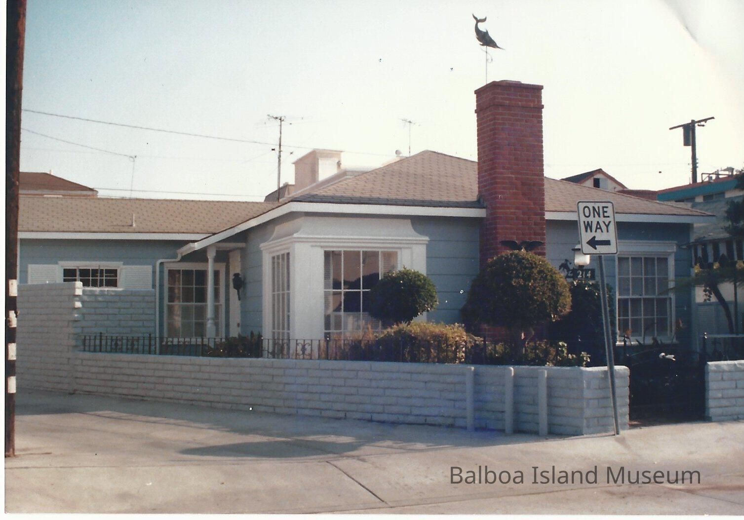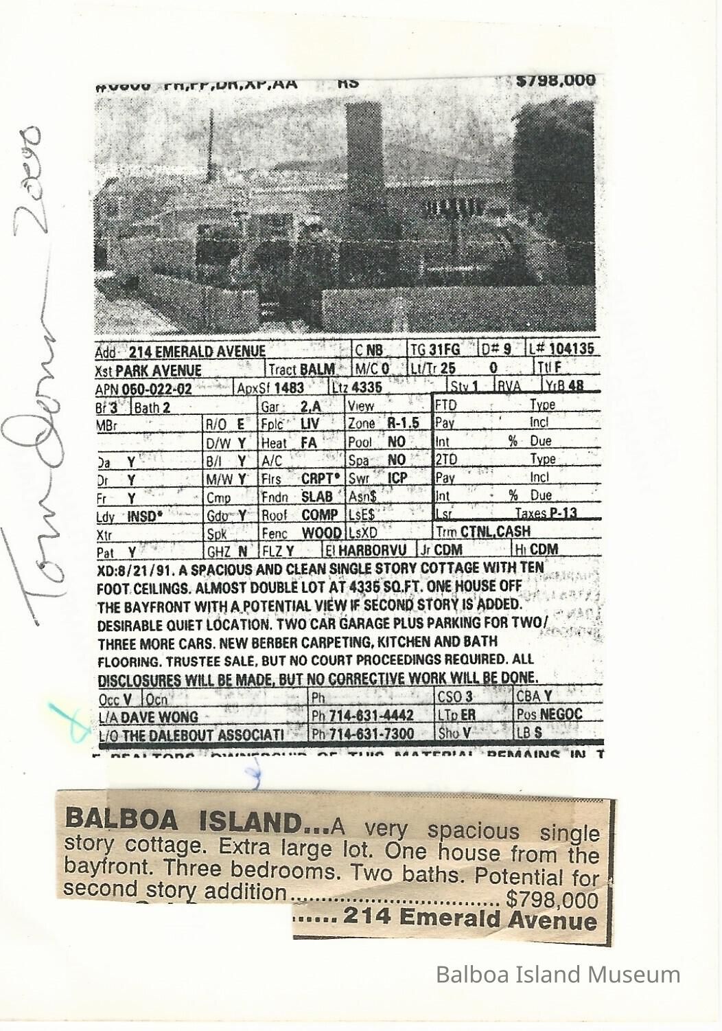 A photograph of the house that used to be at 214 Emerald Avenue. Blue house with a bronze eagle on the fireplace and a marlin lightning rod. The house was torn down in 2000. Ther eis a real estate listing taped to the back and the words "torn down" are written on the photograph.Lexicon