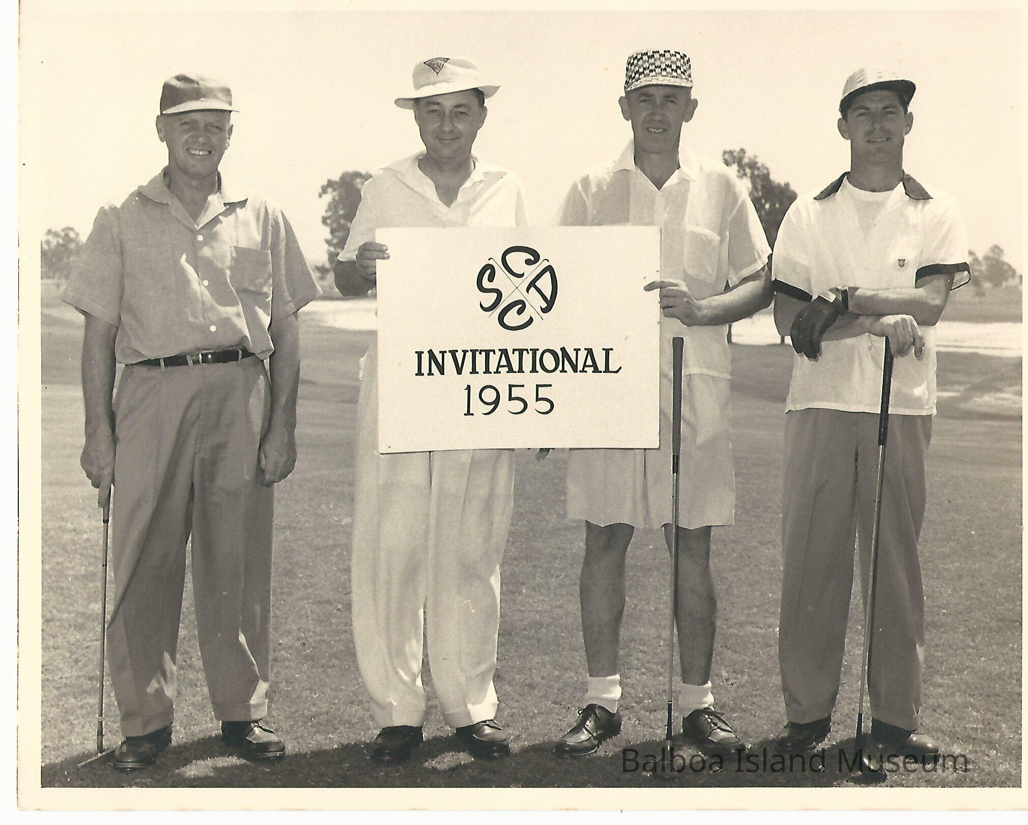 Black and white photo of four golfers posed at 1955 SCCA Invitational.