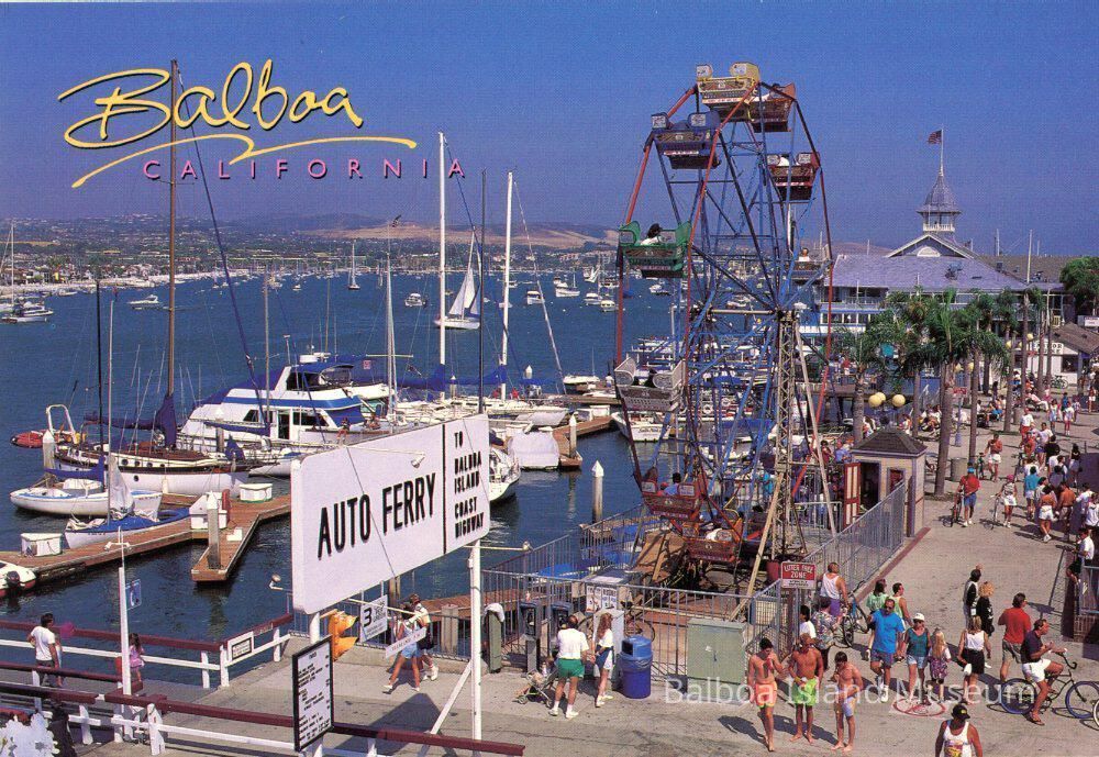 A large color postcard of the Fun Zone front walk with the Ferris wheel and Auto Ferry sign. The Balboa Pavilion is behind them. The harbor is on the left. Balboa is written in yellow in the upper left corner and California is written beneath in pink,