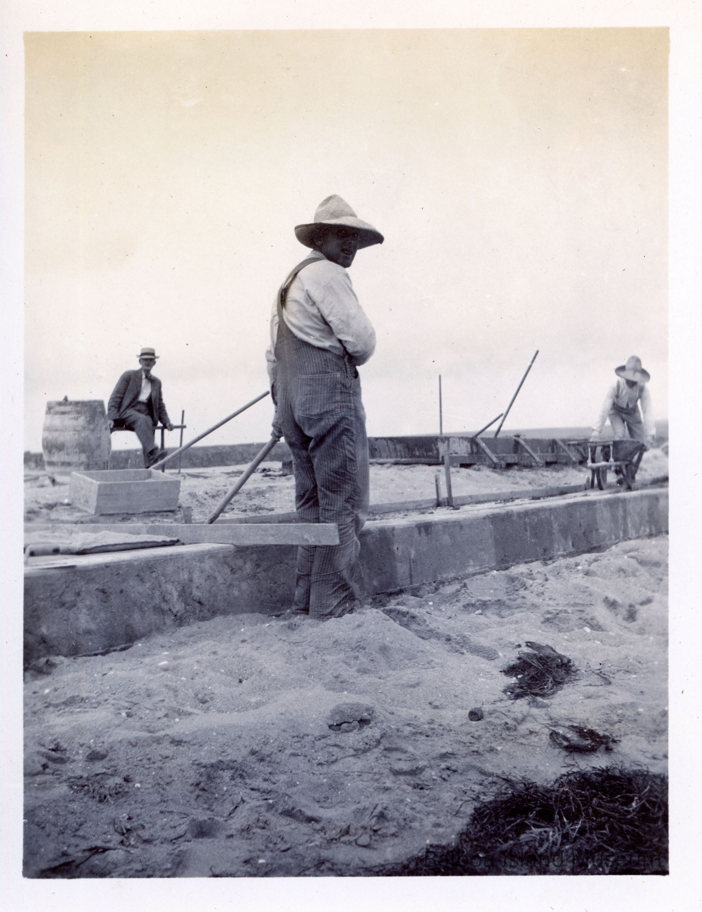 A photograph of two men constructing a seawall while a third man supervises. One of the men, the one holding a shovel to flatten the concrete, is looking at the camera. The supervisor is seated on a wood scaffold near by and the other man who is working is pushing a wheelbarrow on a board suspended over the existing either dirt or concrete filling the trench. Two copies of this photograph- one is darker and adhered to black album page 1. The second is lighter and loose.