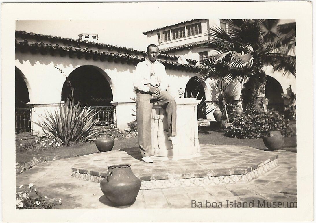 A photograph of Harold Caldwell sitting on the edge of a fountain or pedestal in Ensenada.Collection