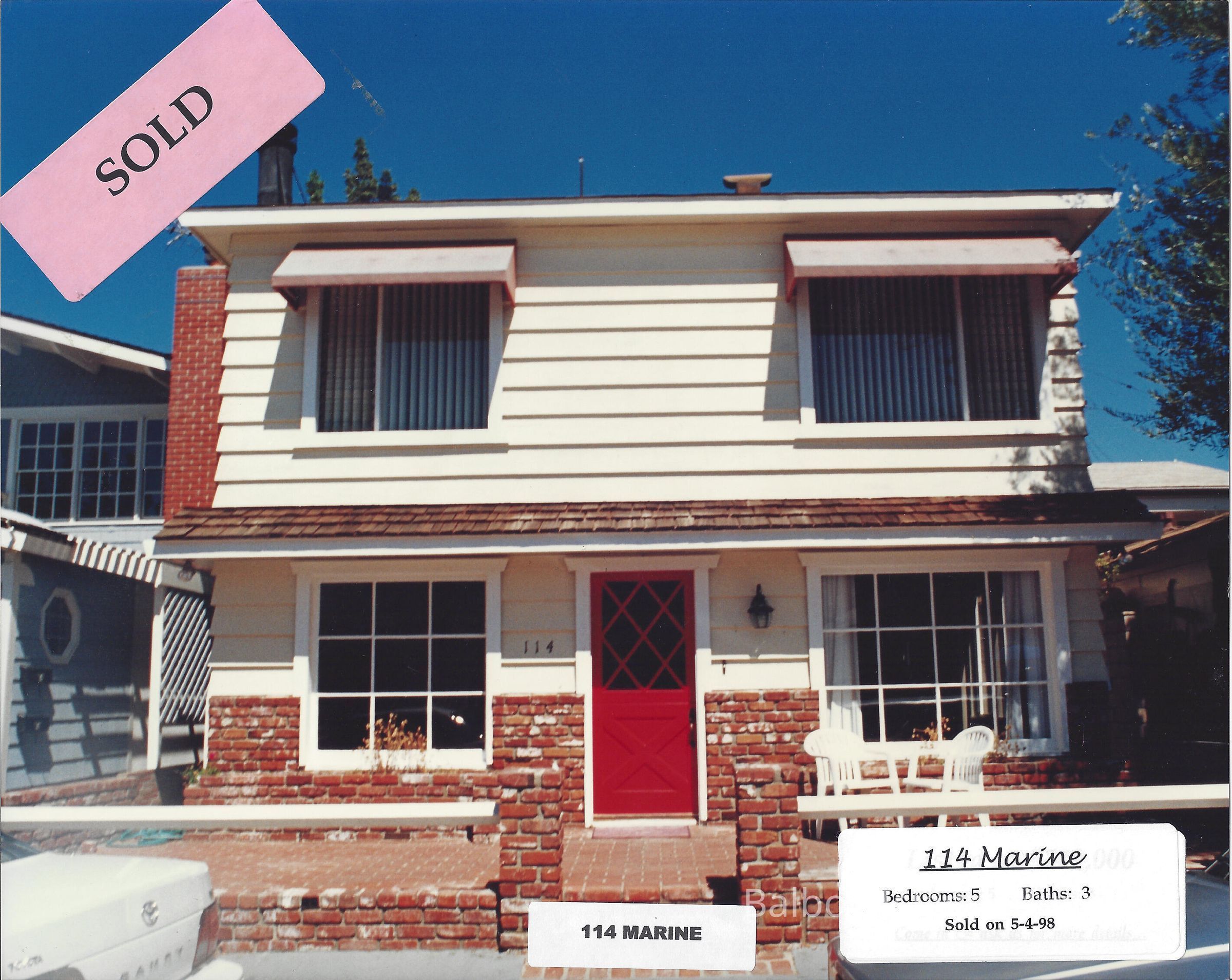 Photo of front of house at 114 Marine. It is listed as a 5 bedroom, 3 bathroom home. The house was two stories with a brick facade half way up the ground floor and horizontal slats from the middle of the ground floor up. The two upper windows have sun awnings and there is a small roof running along the ground-second floor line on the front. The door is red and the slats are painted a creamy yellow color. The house was built in 1949.Photograph Details
