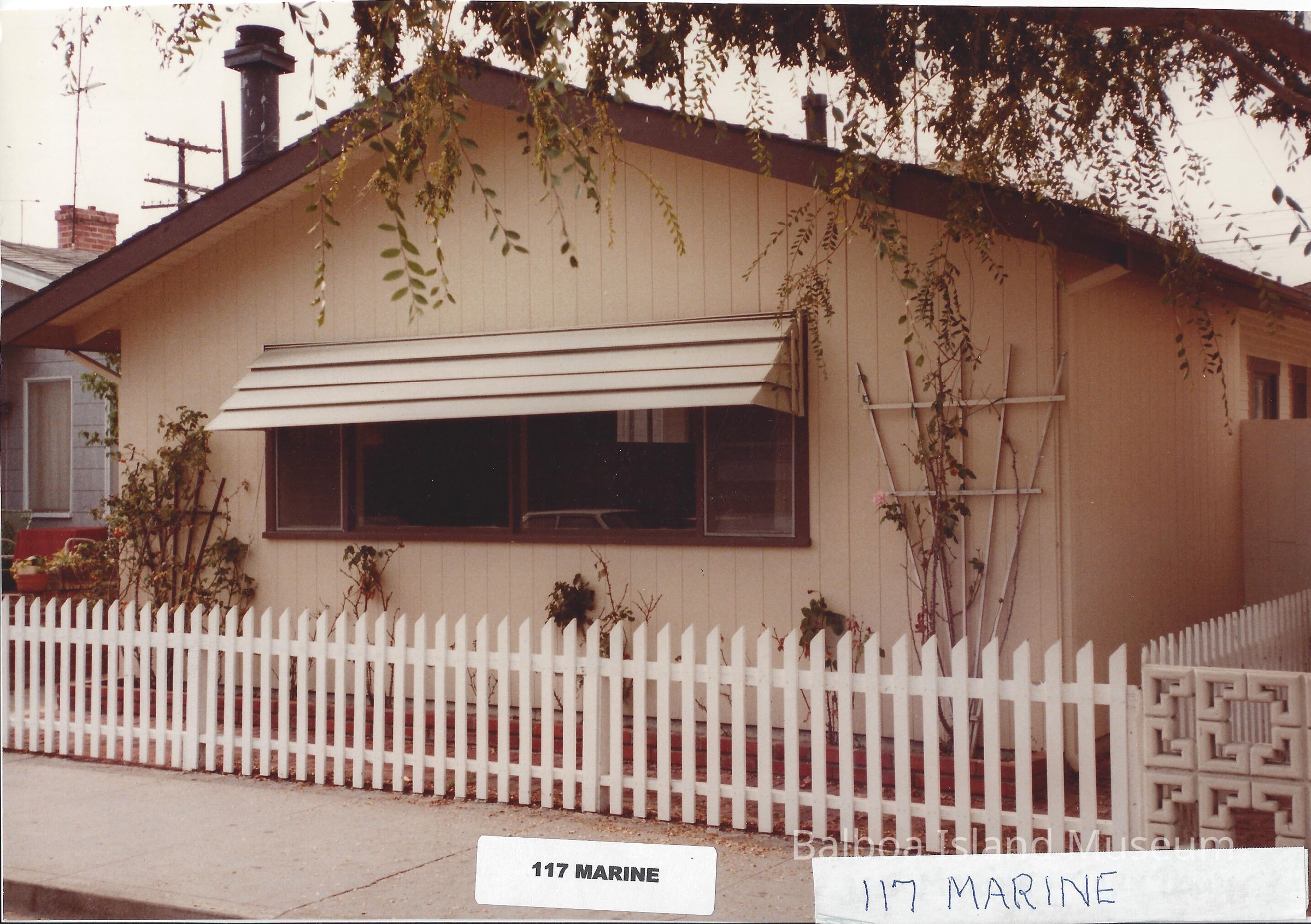 Photo of front of the previous house at 117 Marine Avenue. The house was single story with an gable roof and a long window along hte front. The outside was covered with vertical planks and pained a yellow-cream color.