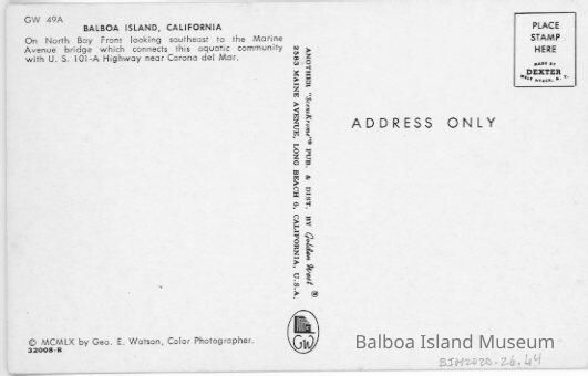 Published by Golden West in Long Beach, California. Printed by Dexter Press in West Nyack, NY. There is a paragraph about North Bay Front on the back. Postcard number GW 49A. Print number 32008-B. Photograph by George Elton Watson. Copyright 1960.Subject