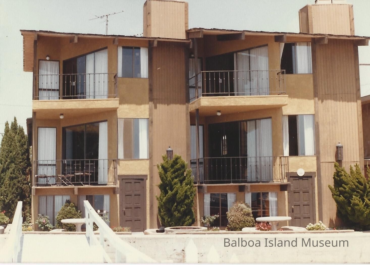 A photograph of an unknown apartment building on Balboa Island. There is a dock or mooring connected to the property. The building is three stories tall and appears to have six different apartments in it.