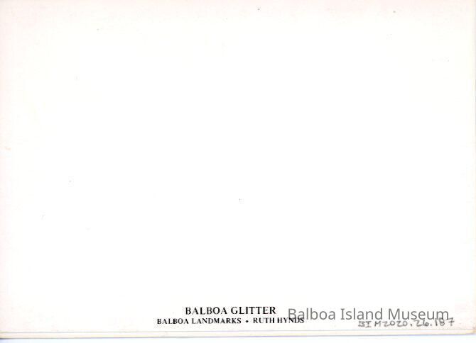 A notecard with a painting on the front done by Ruth Hynds of the Balboa Pavilion lit up at night. Painted from on the water to the west of the Pavilion. Part of the Balboa Landmarks series by Ruth Hynds.Collection