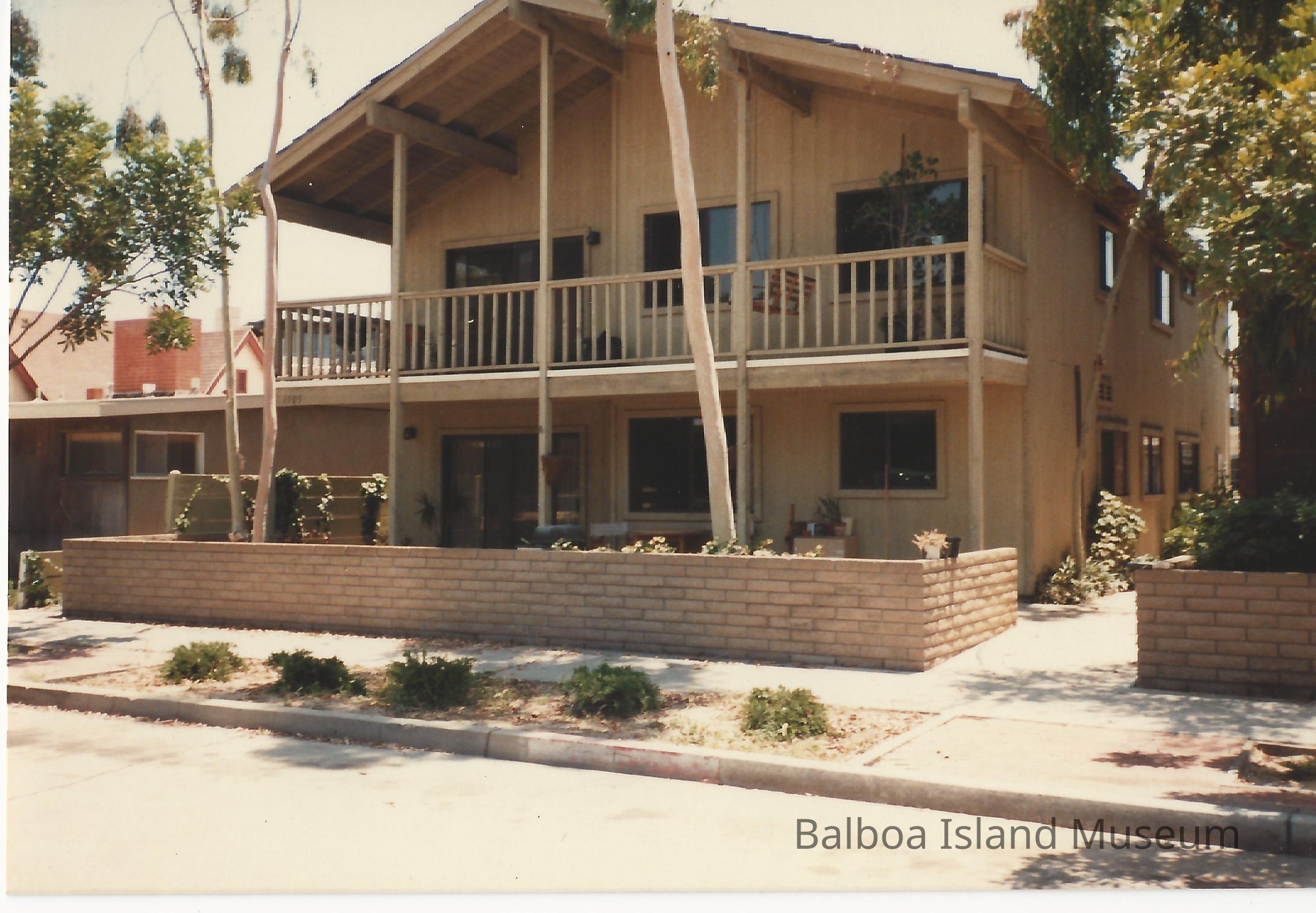 A color photograph of 1505 East Balboa Blvd. The house is two stories, with a peaked roof and a balcony running the entire face of the front of the building.Lexicon