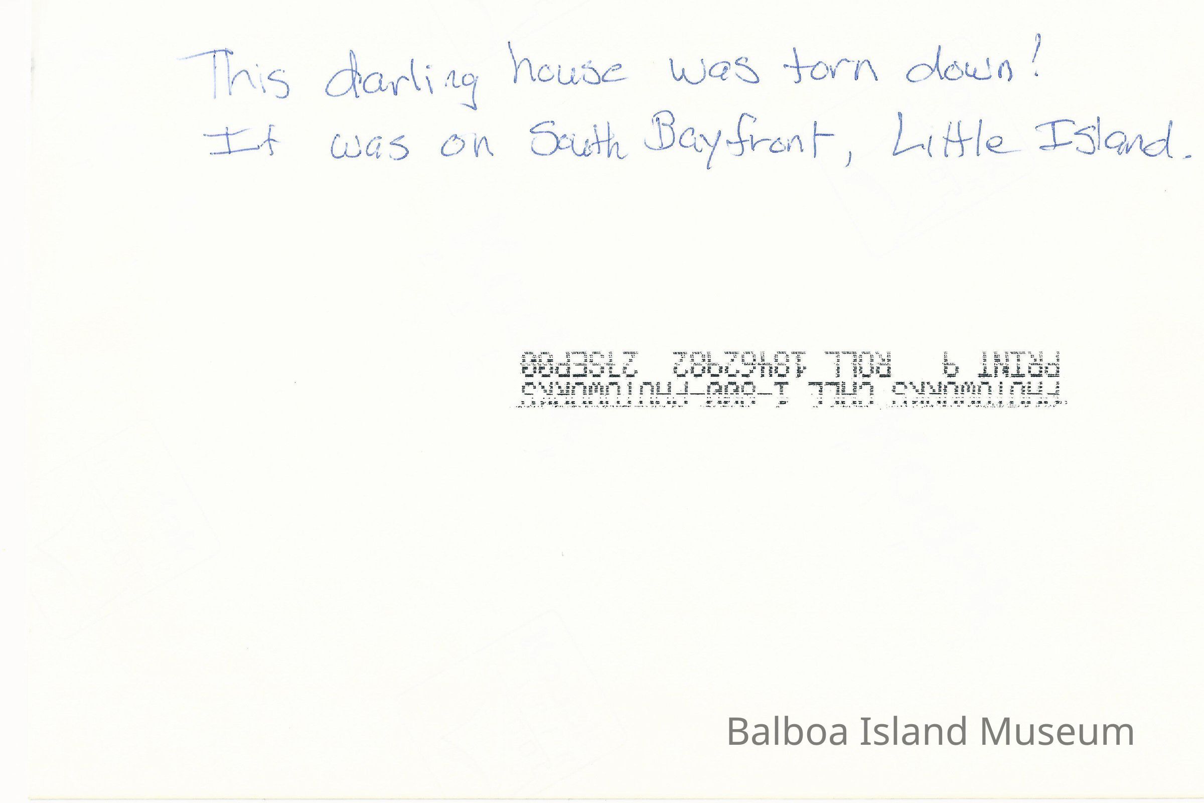 The back reads: "This darling house was torn down! I was on South Bayfront, Little Island."Lexicon