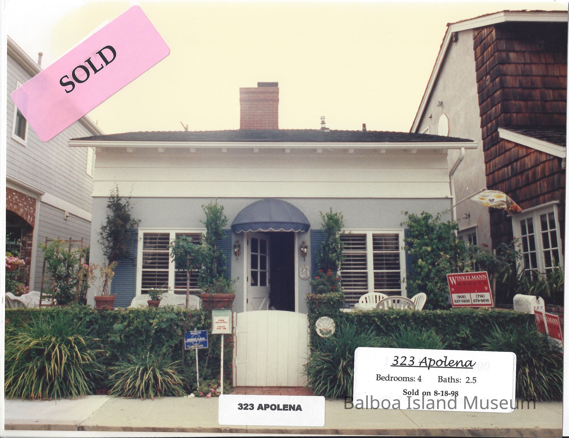 Exterior photo of the front of home at 323 Apolena Avenue. Stick on front says 4 bedroom 2.5 bath sold on 8-18-98. Sticker on reverse says listed at $840,000 Sold at $840,000.Lexicon