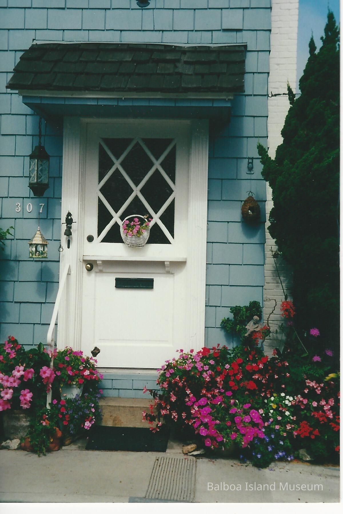 A photogrpha of the front door of 307 Abalone Avenue. The house is one with a historic plaque and was still standing as of November 2017.Lexicon