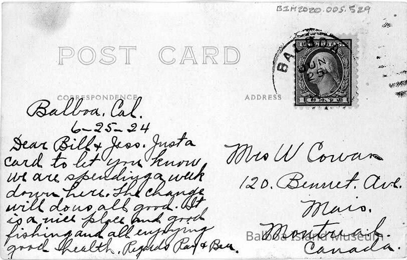 Sent Une 25, 1924 from Balboa to Montreal, Canada. Sent to Mrs. W. Couran [?] from Ray & Beu.