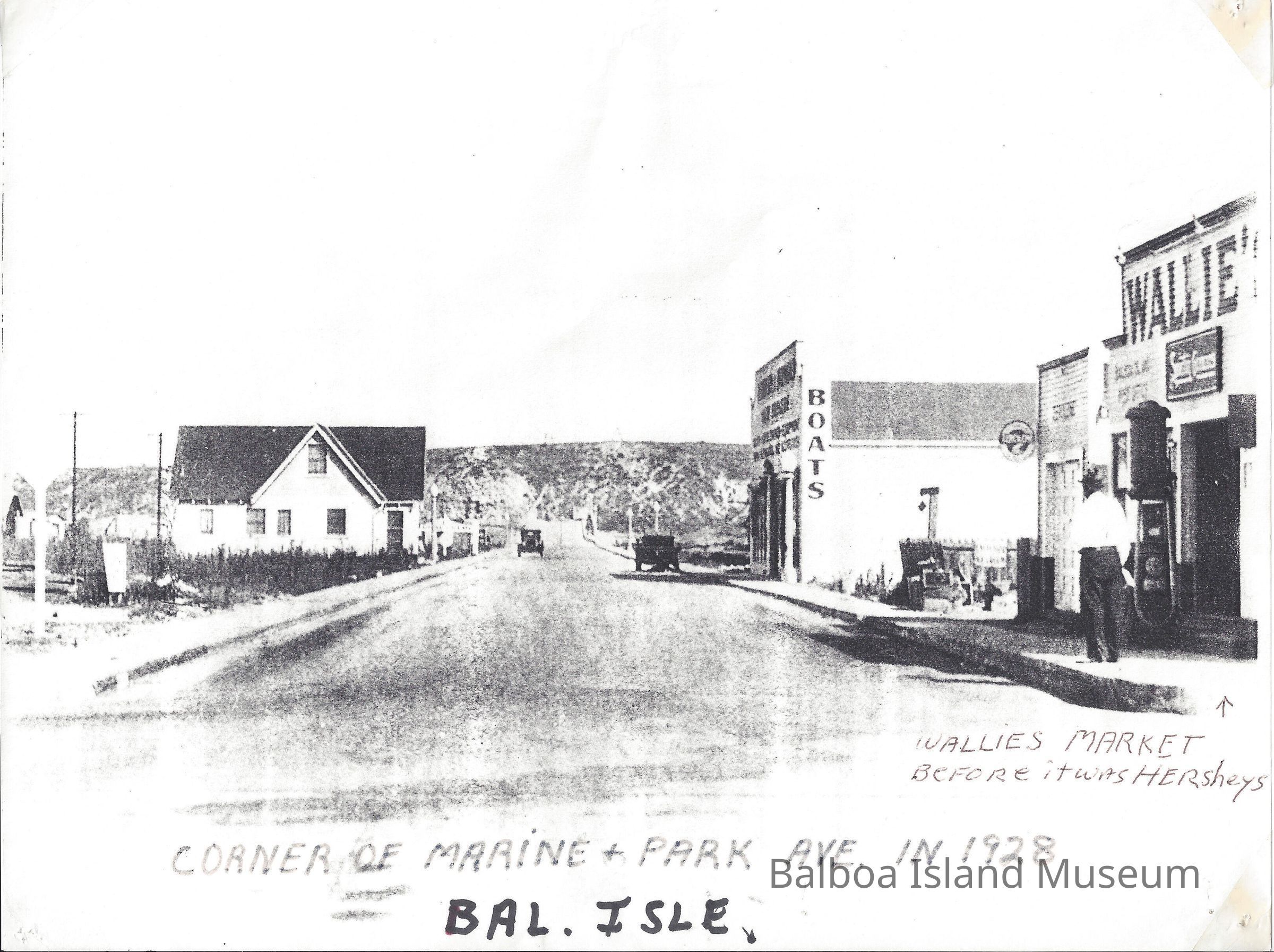 Photocopy of photograph showing corner of Marine and Park Avenues. Highlights Wallie's market and Boat store