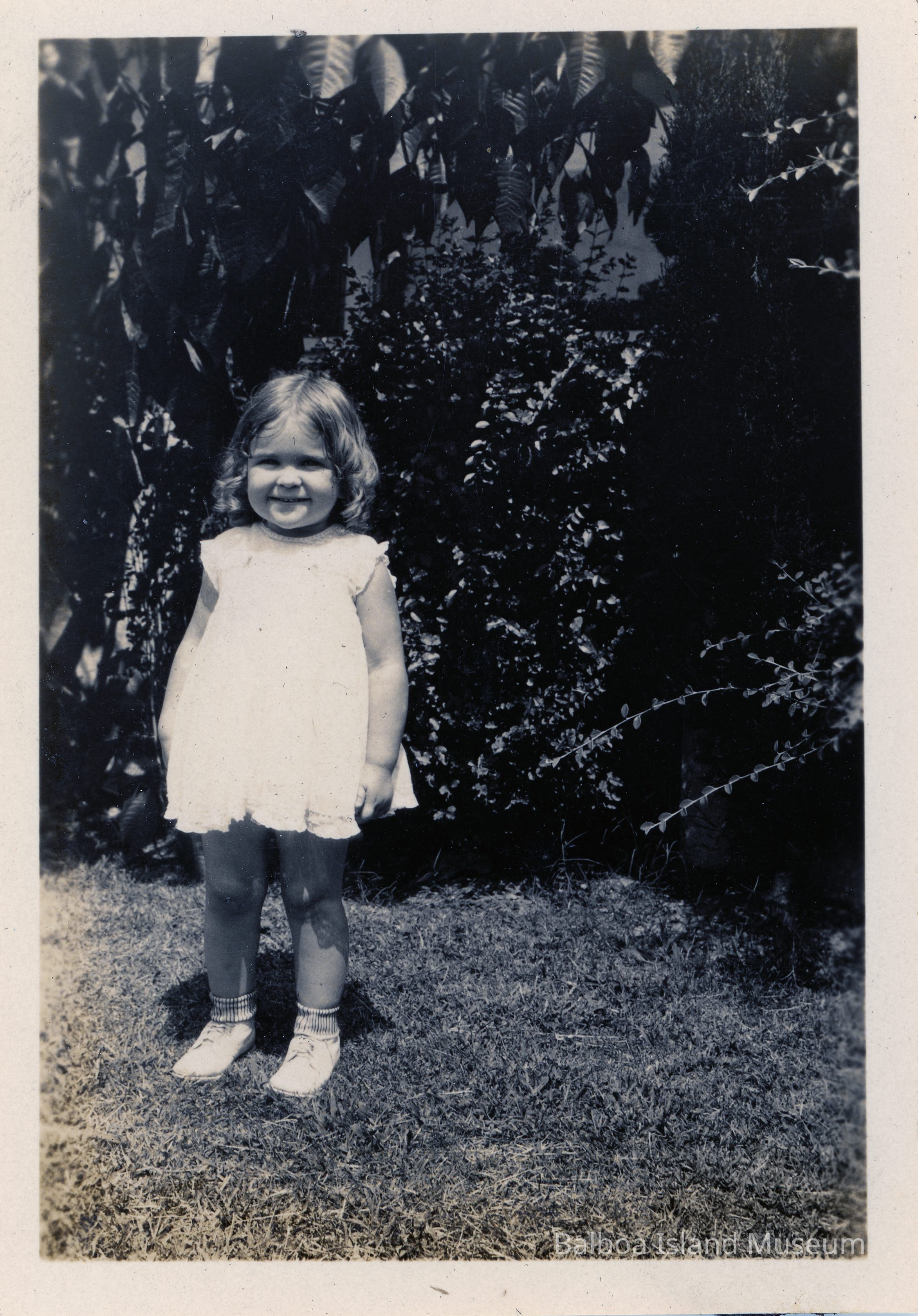 Photo of little kid smiling in a white dress in front of some greeneryPhotograph Details